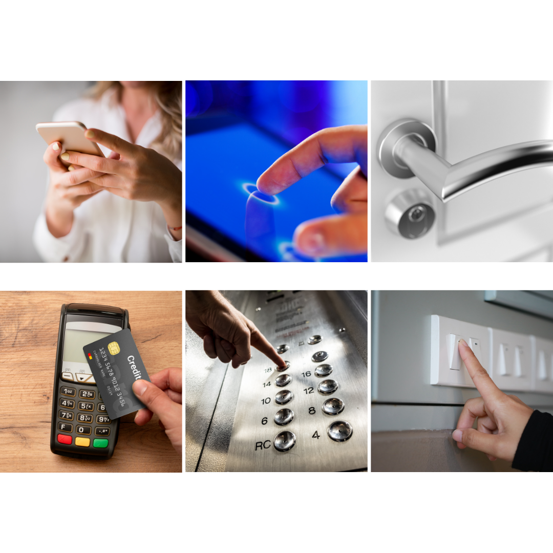 Suitable for plastics, glass, ceramic, wood and metals, including doors, handles, elevator buttons, stair rails, toilet seats, switches, touch screens, desk surfaces, shopping trolleys, car dashboards, payment terminals.